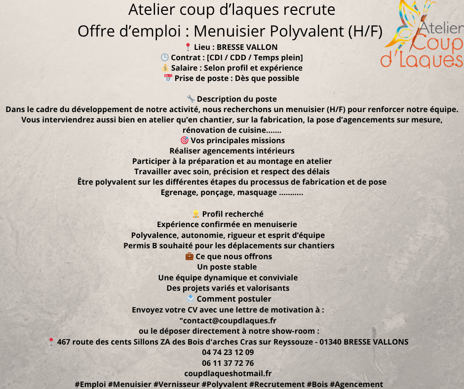 rechercher , personnel ,menuisier, poseur,bois ,ain ,motivé dans l'Ain