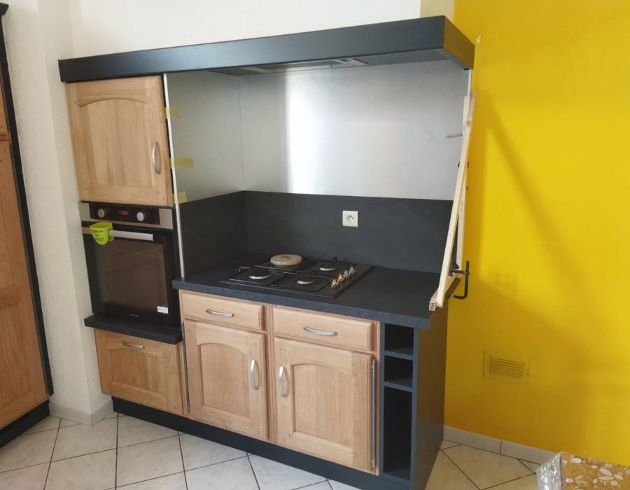 Nous avons apporté un tout nouveau style à cette cuisine grâce à des façades aspect brut, accompagnées de nouvelles poignées, et de caissons laqués en gris. Le plan de travail ainsi que la crédence ont également été remplacés pour compléter l’ensemble.