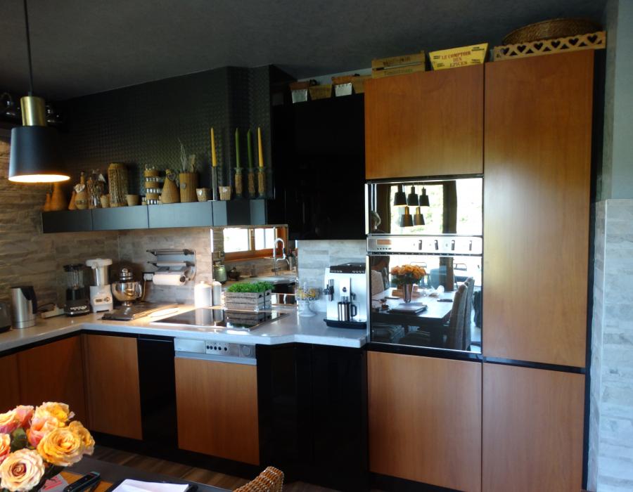 Cette cuisine laquée noire couvrante est totalement moderne.