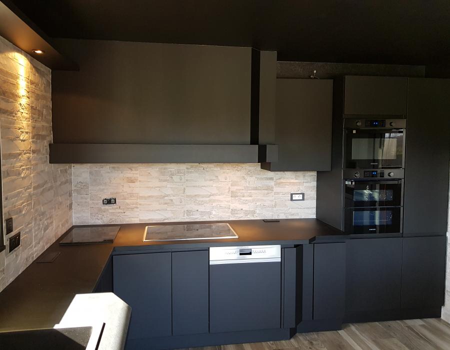 Nous avons placé des luminaires supplétoire afin d'éclairer davantage la pièce. De plus, nous avons incrusté une plaque de granit dans le nouveau plan de travail ainsi que des prises pour que le quotidien de nos clients soit le plus agréable possible.
